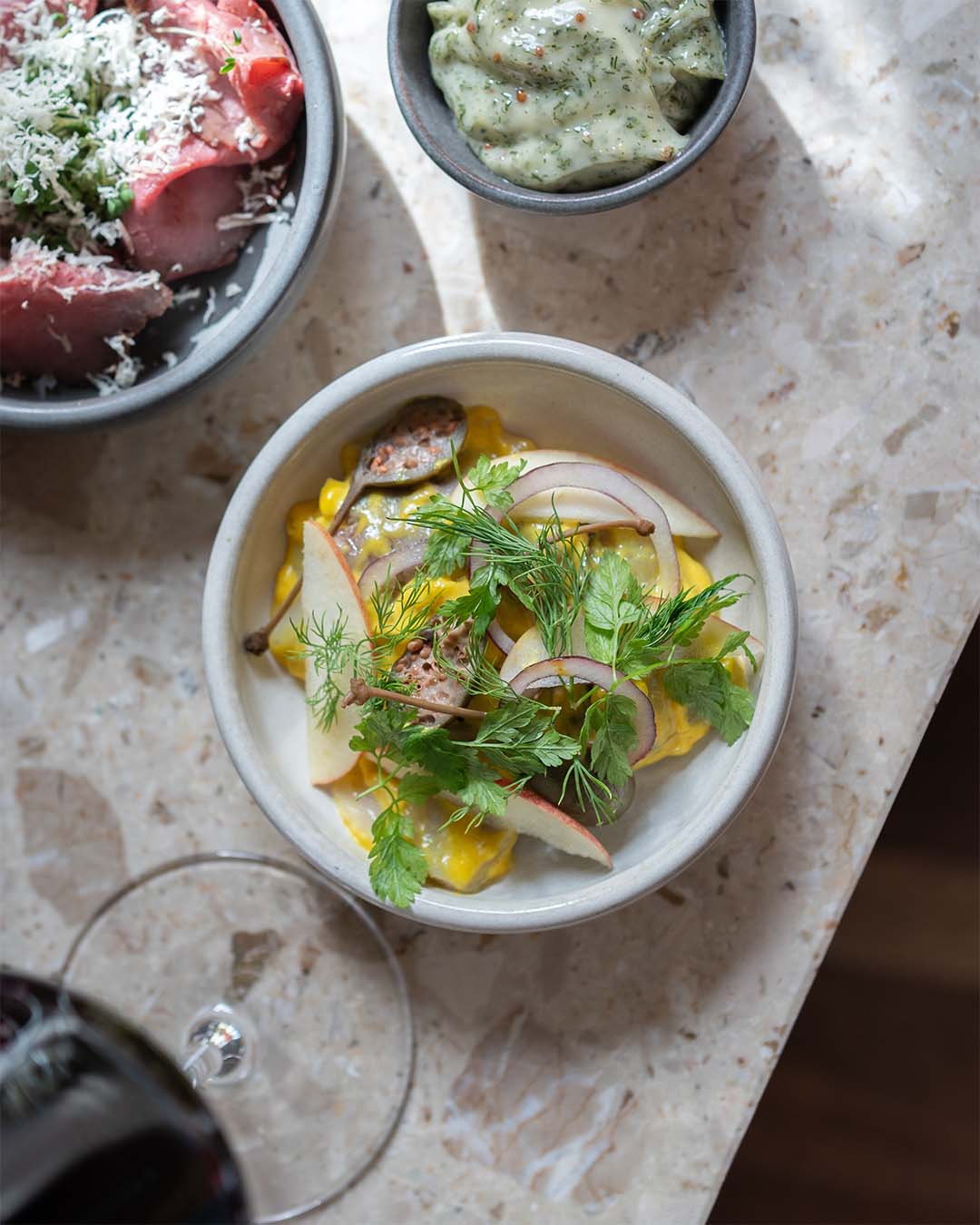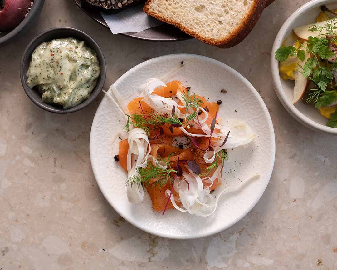 Gravad laks, enebær, fennikel, rævesauce og frisk dild.