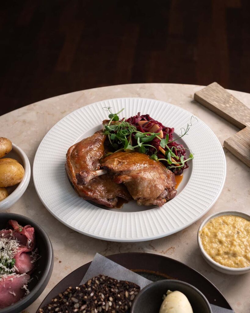 Andesteg med æble, syltede rødkål og appelsins sovs.