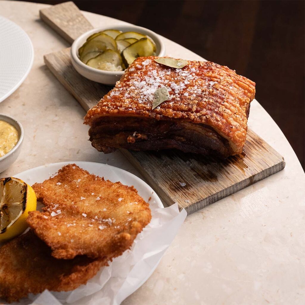 Flæskesteg, syltede agurker og sennep mayonnaise.